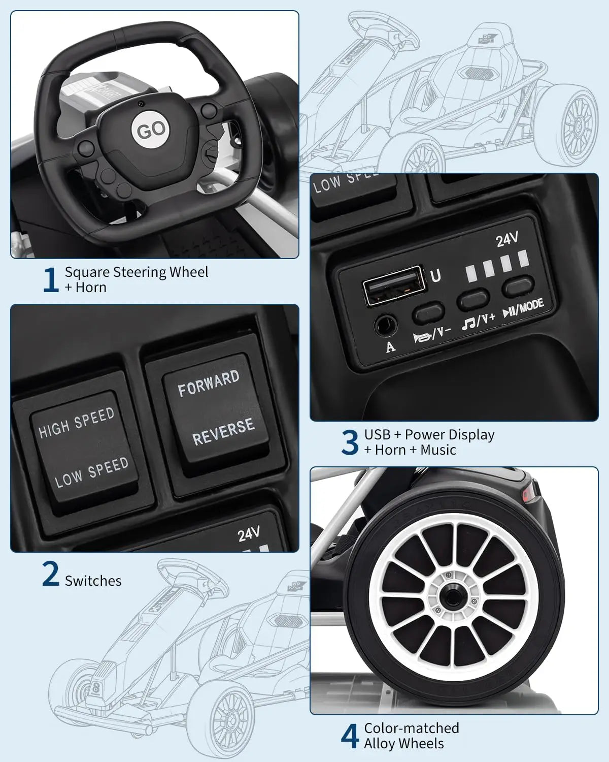 Ideal Gift Choice: With overall dimensions of 43.3” L x 30.34” W x 21.18” H, this go-kart is powered by a 24V 9Ah battery and dual motors. It comes with built-in music and a horn, making it a perfect birthday or Christmas gift for kids aged 6-12 years.