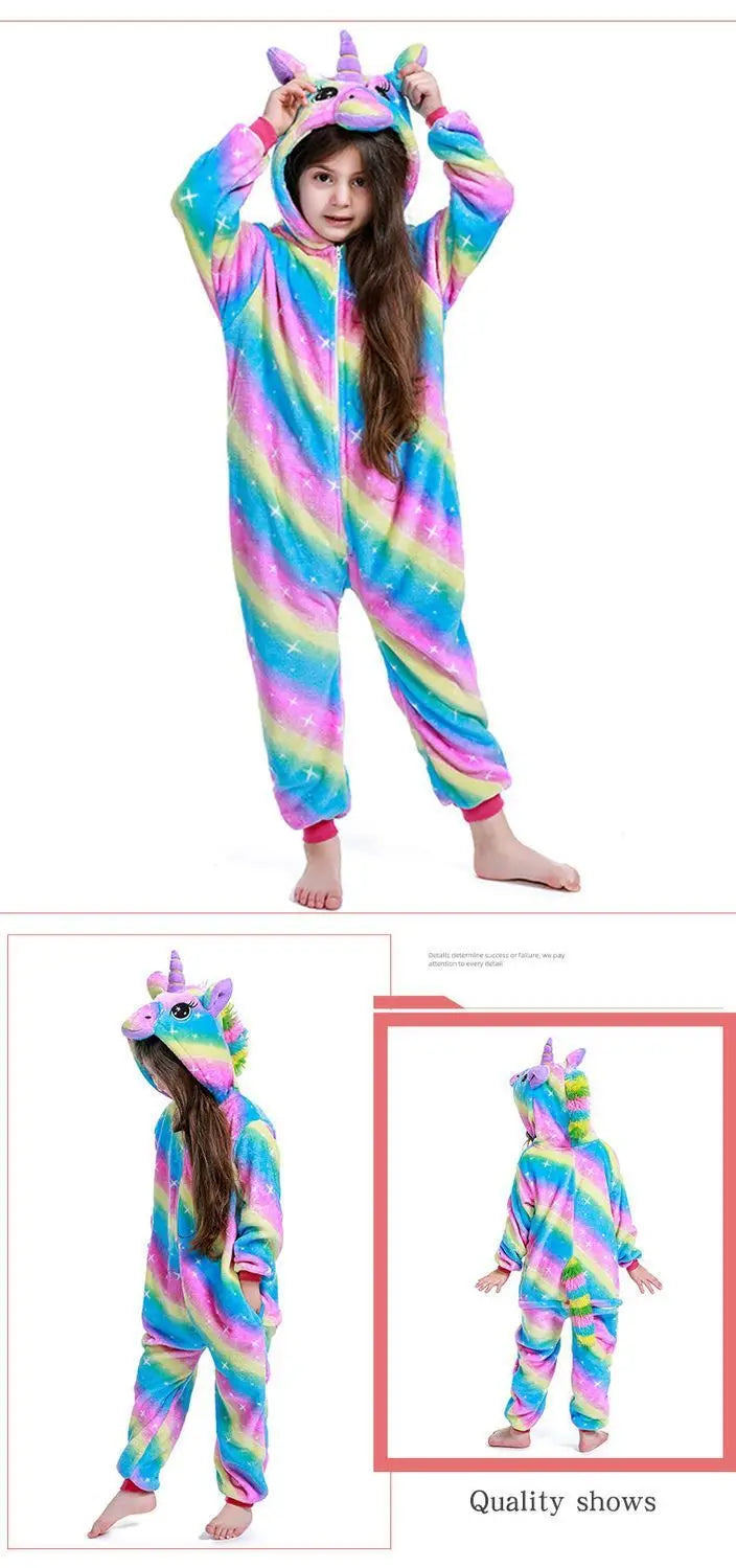 Kids Unicorn Animal Jumpsuits Cartoon Pajamas Cosplay Holiday Costume Cat Panda Flannel Sleepwear for Children Outfits 4-12Yrs