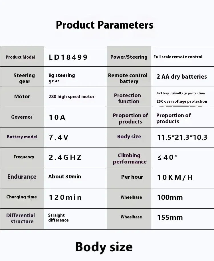 8. Sustainable power consumption for 30 minutes, fully proportional linear control of throttle and steering, motor with locked rotor protection, battery circuit board with overcharge, overdischarge, low voltage protection, automatic frequency matching, remote control distance of 20 meters