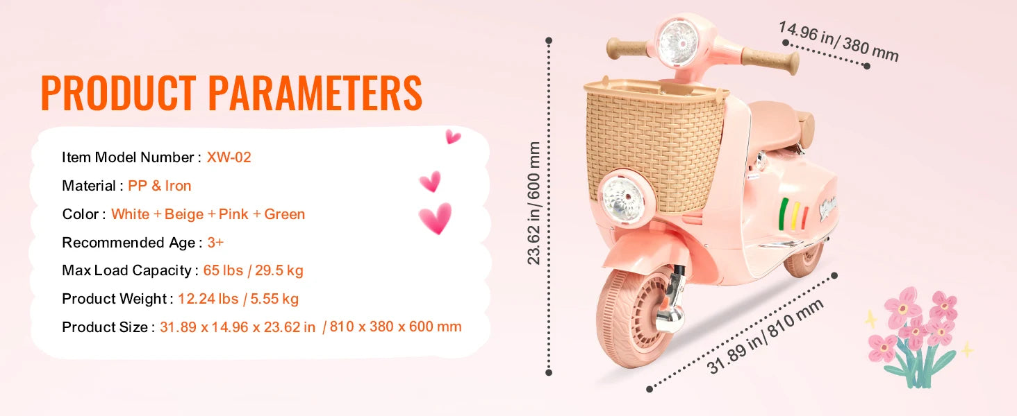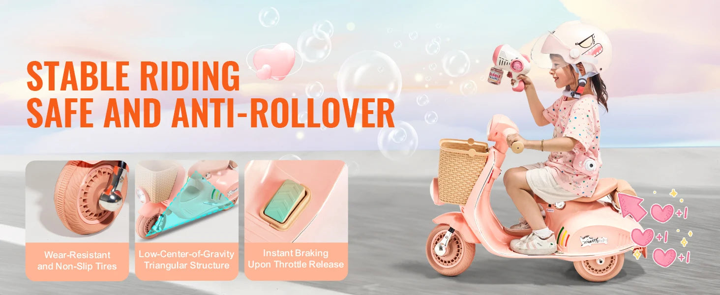 Durable and Reliable: Powered by a reliable lead-acid battery, our girls motorcycle provides great performance and long-lasting fun. Smart voltage control reduces energy waste and keeps the fun going longer, so parents can enjoy more quality time without constant recharging.