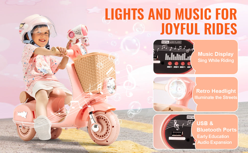 Cool and Entertaining: Your child will be the star of the block with this retro-styled ride on motorcycle! It comes with music playback, USB, and Bluetooth options for endless entertainment on the go. Plus, flashing LED lights and lively music make every ride an exciting adventure!