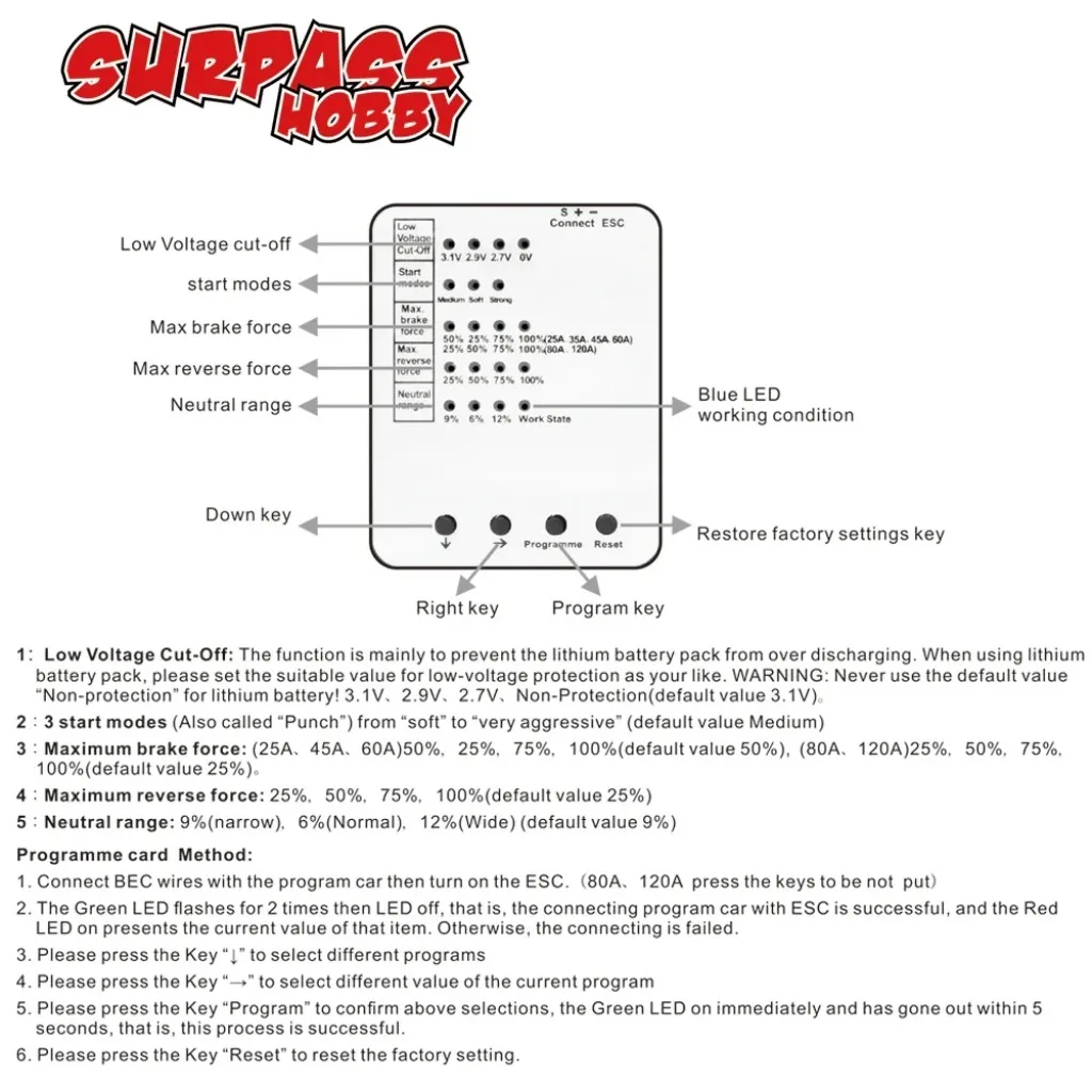 5. Multiple protection features: Low voltage cut-off protection for litium or nickel battery /Over-heat protectionThrote signal loss protection / Motor blocked protection/