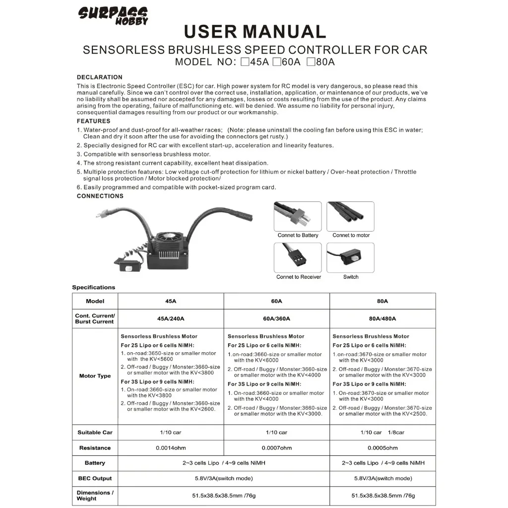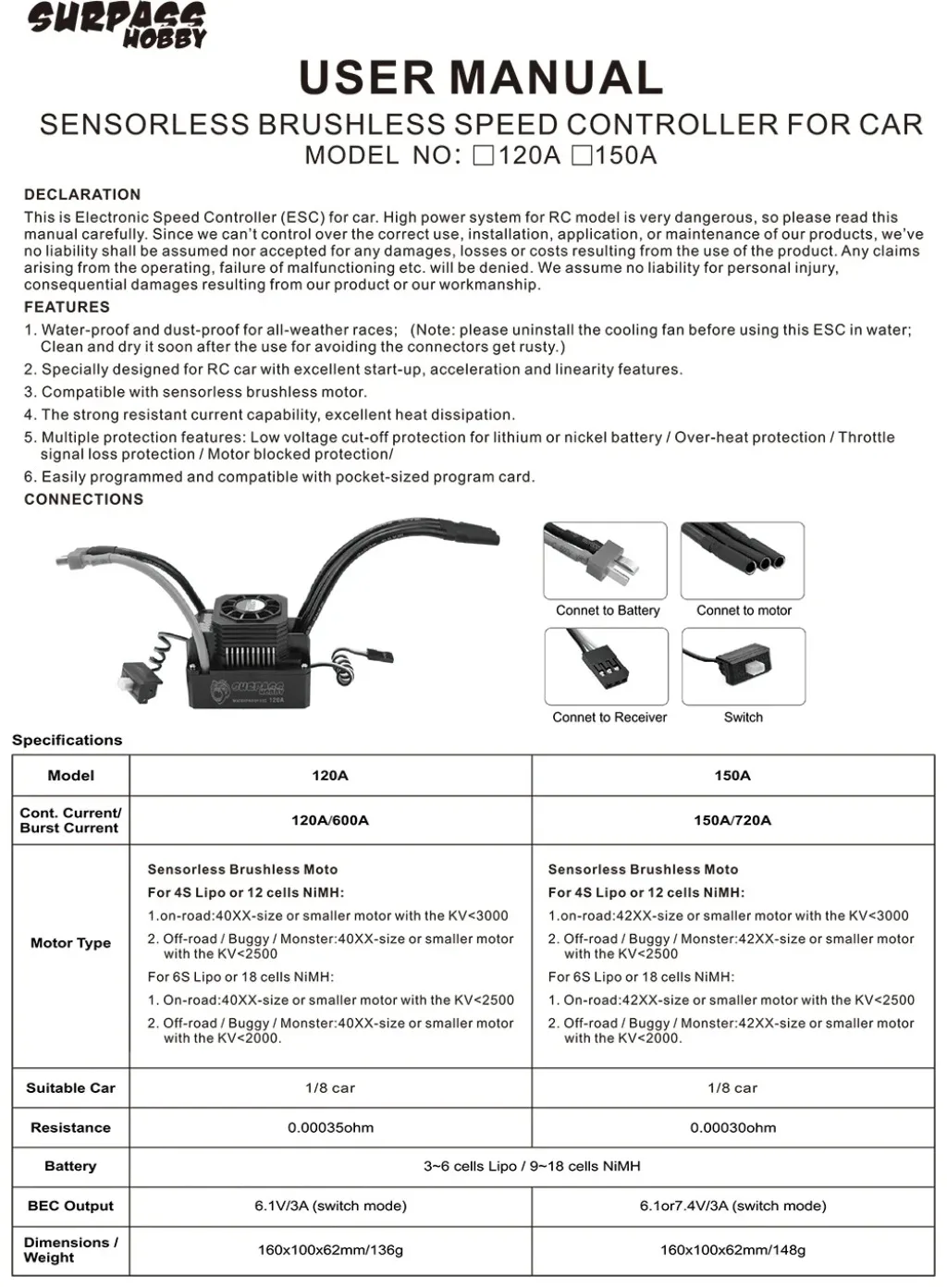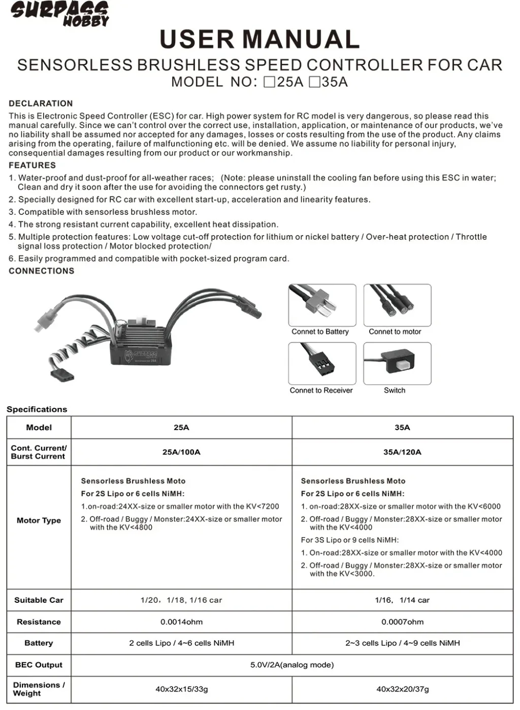 1.This is Electronic Speed Controller (ESC) for car. High power system for RC model is very dangerous, so please read this manual carefully.