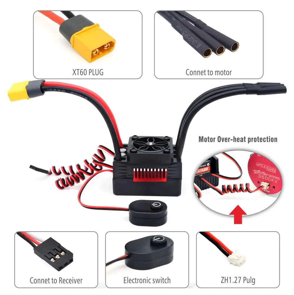 1. Water-proof and dust-proof for all-weather races; (Note: please uninstall the cooling fanbefore using this ESC in water; Clean and dry it soon after the use for avoiding the connectors get rusty.)