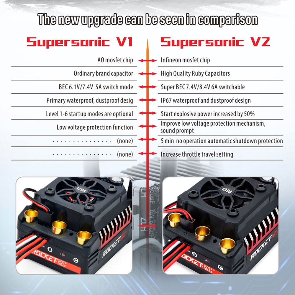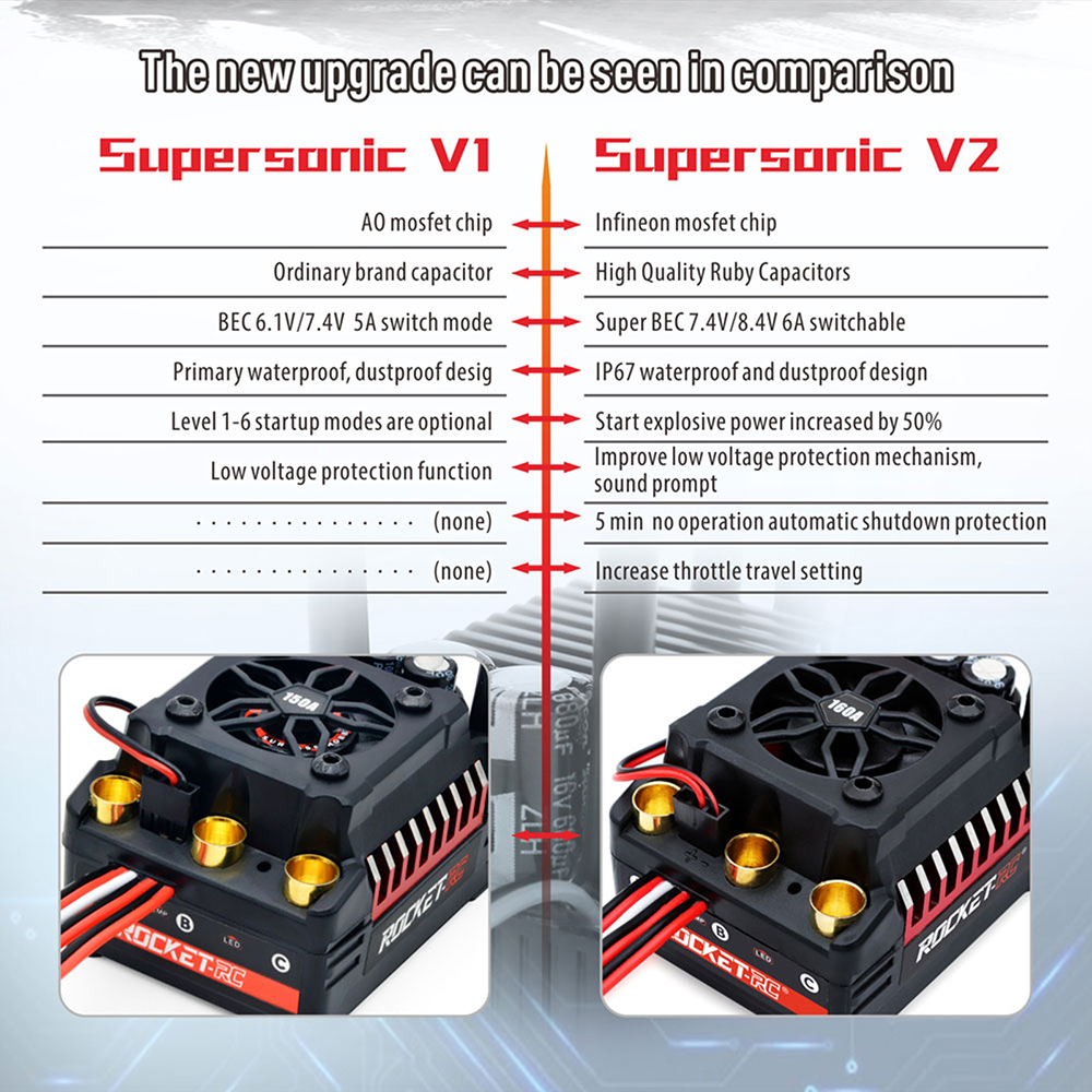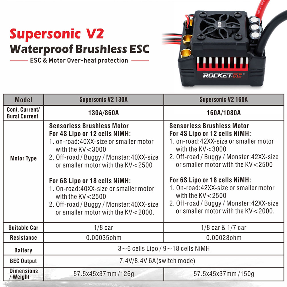 Rocket RC Supersonic 130A 160A Brushless ESC application for 1/8 car &1/7 car.Water-proof and dust-proof for all-weather races.Compatible with Supersonic V2 sensorless brushless motor