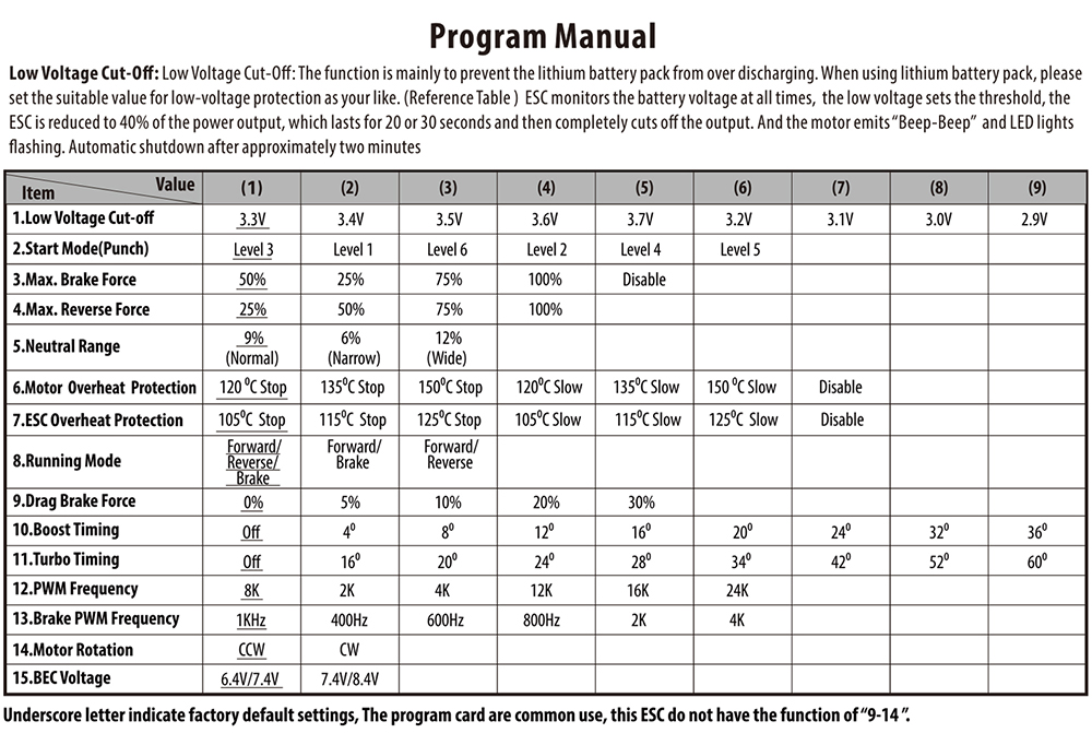 7.ESC Overheat Protection:105℃ Stop、95℃ Stop、105℃ Stop、 95℃ Stop、Disable(default 105℃ Stop)