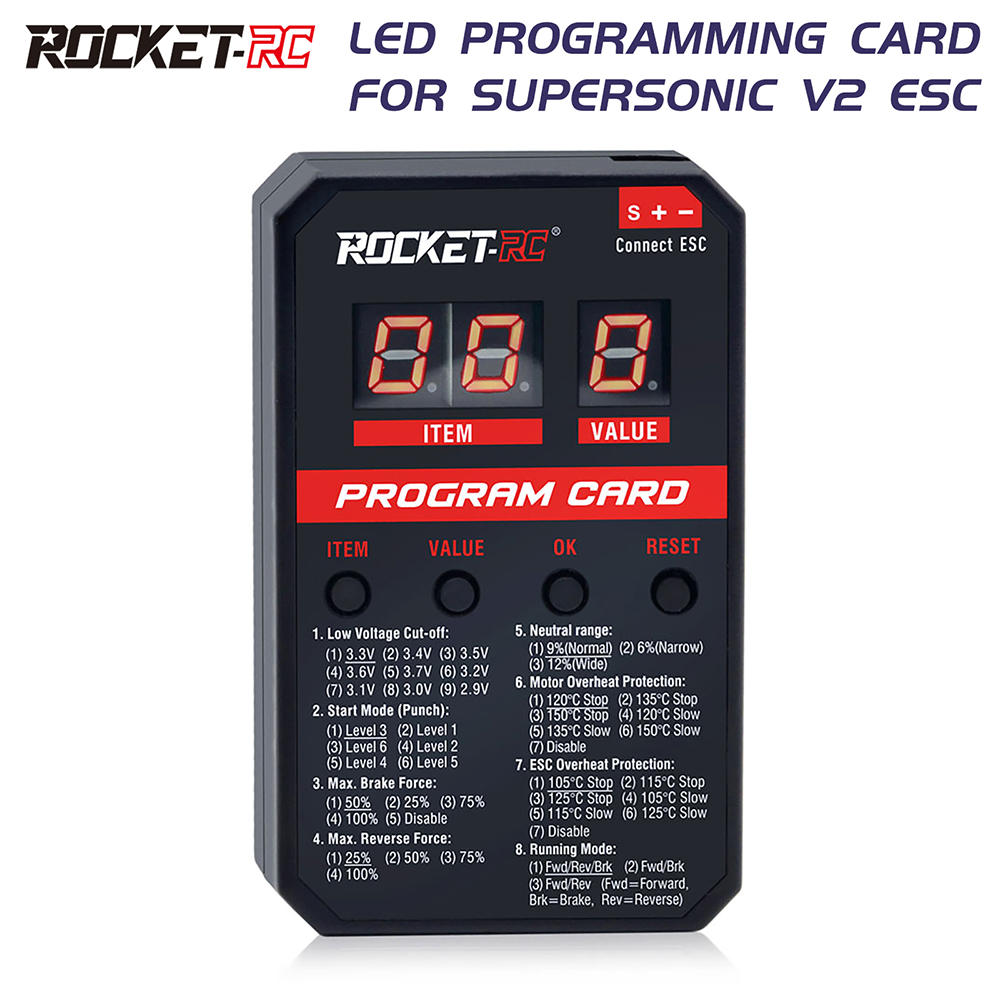 1.ESC Programming Card: Specially designed for Rocket V2 Supersonic 45/60/80/120A/150A ESC with excellent start-up, acceleration and linearity features