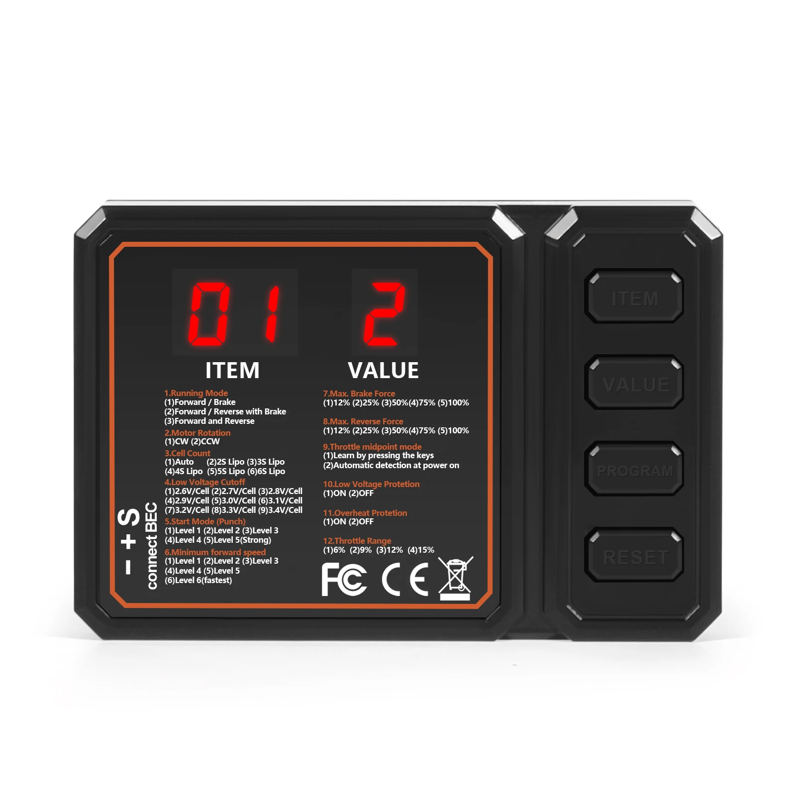 4.Performance: Proportional brake with 4 steps of maximum brake force adjustment and 8 steps of drag brake force adjustment; 9 steps of acceleration(punch) adjustment from "soft" to "Very aggressive" to fit for different kinds of models, tires and tracks