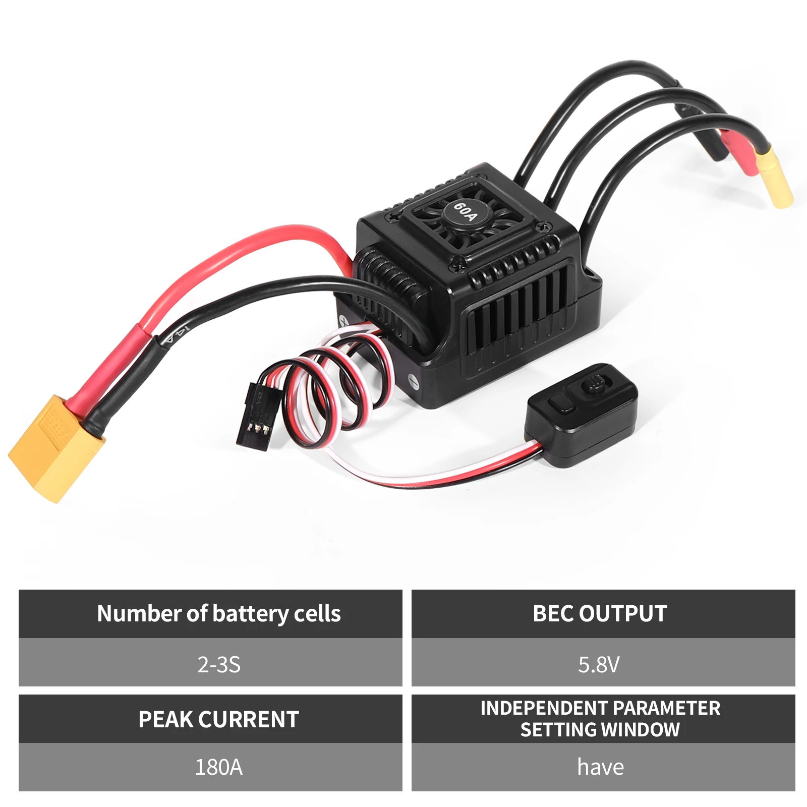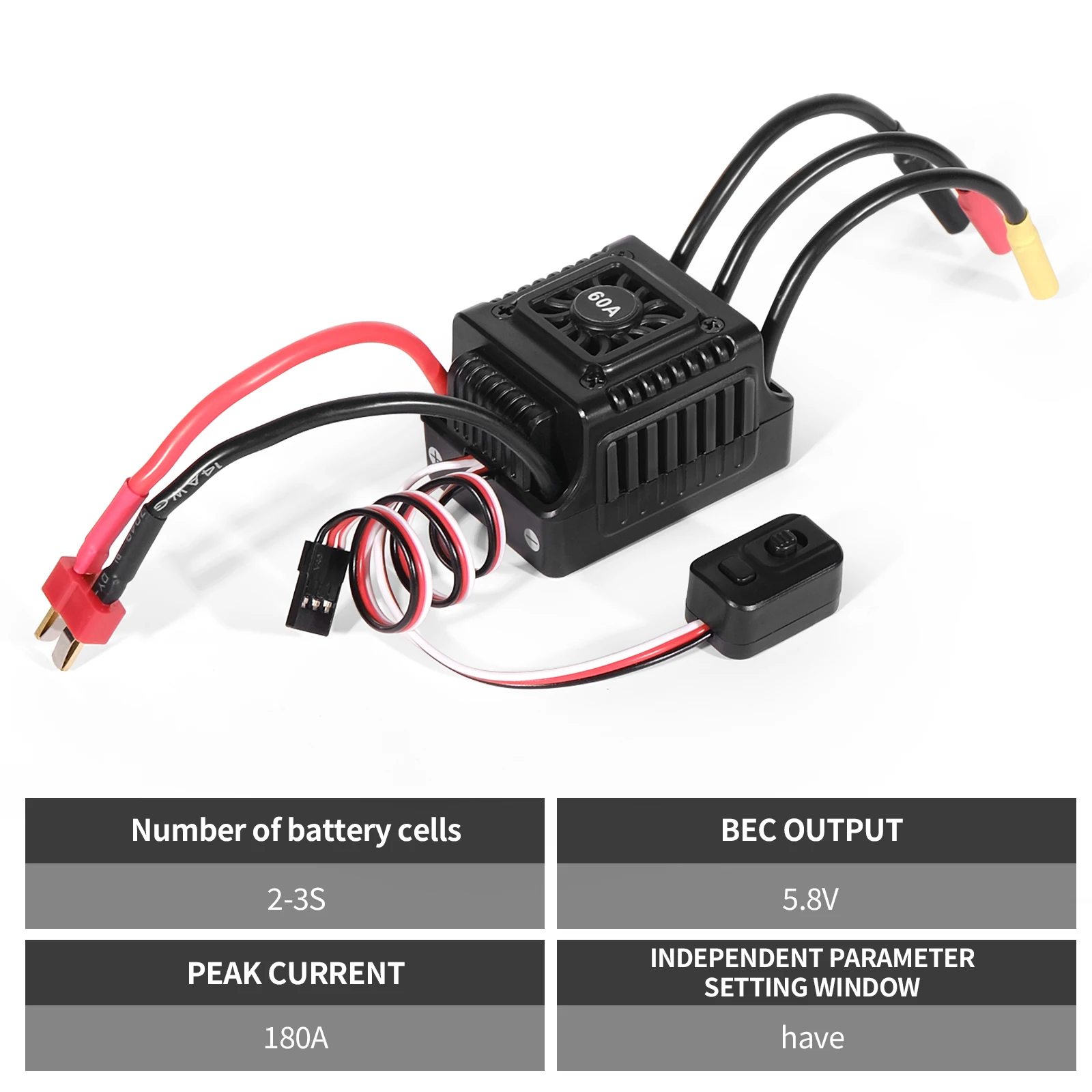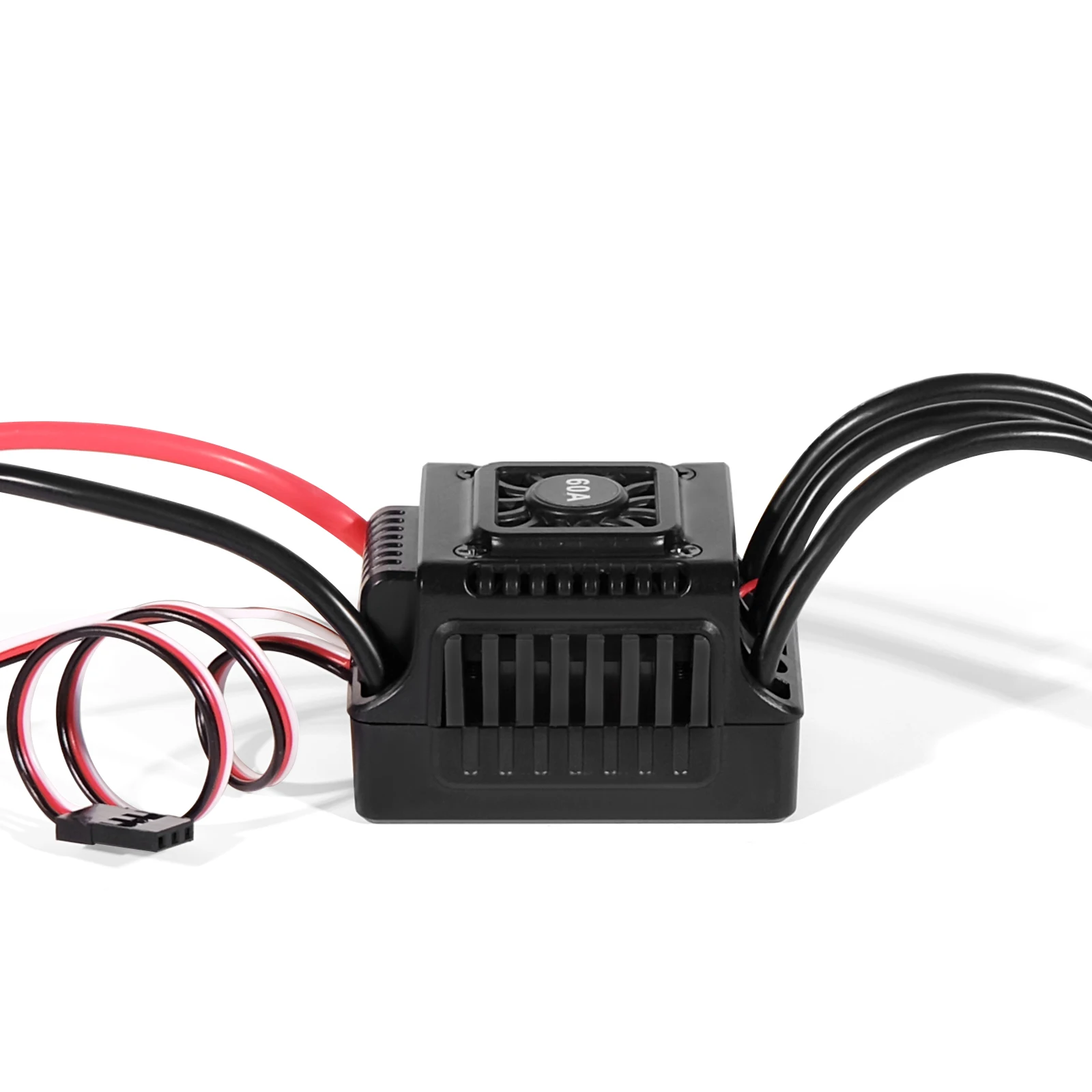 1.Water-proof and Dust-proof: The WSDT-60A brushless RC 60A ESC suitable to all-weather sport races; (Note: please uninstall the cooling fan before using this ESC in water; Clean and dry it soon after the use for avoiding the connectors get rusty.)